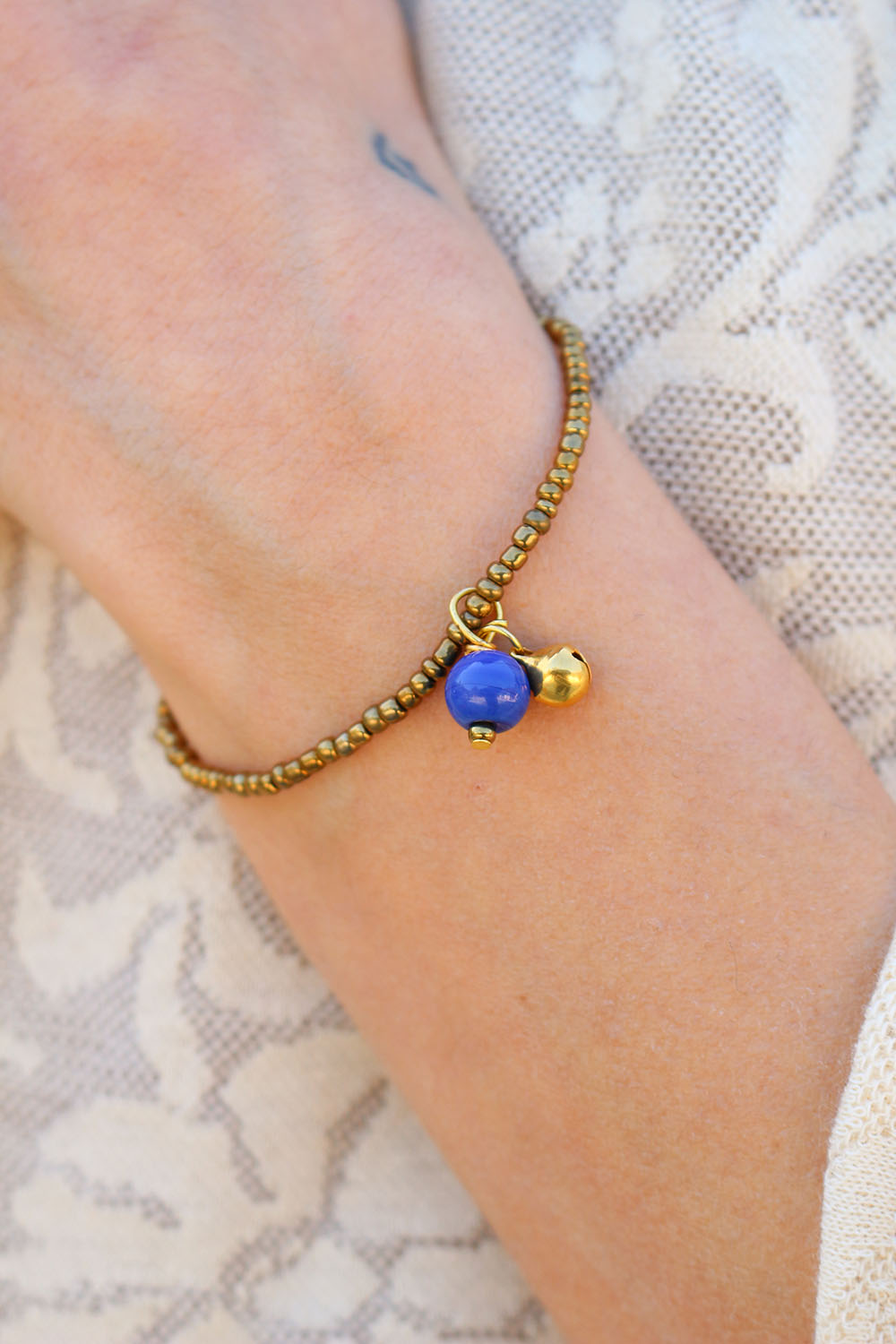 Bracciale con elastico realizzato con perline e campanellina di recupero.