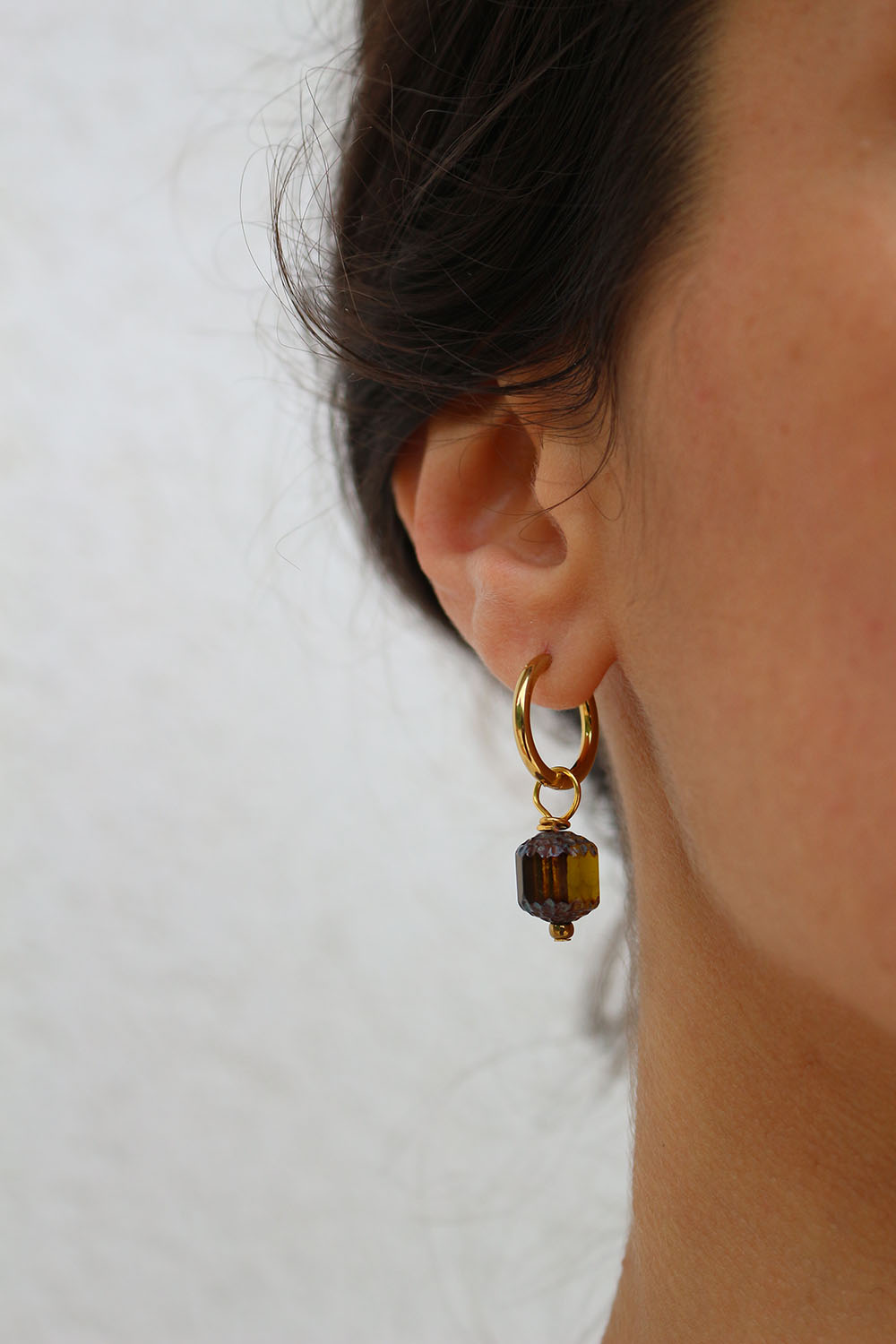 Orecchini molto semplici ma dai riflessi brillanti, pensati per dare luce e colore al viso, perline di recupero, cerchietto in acciaio inossidabile color oro nickel free.