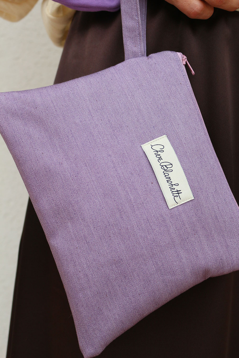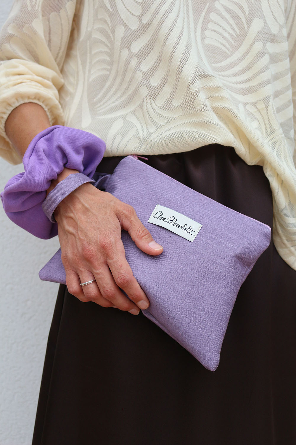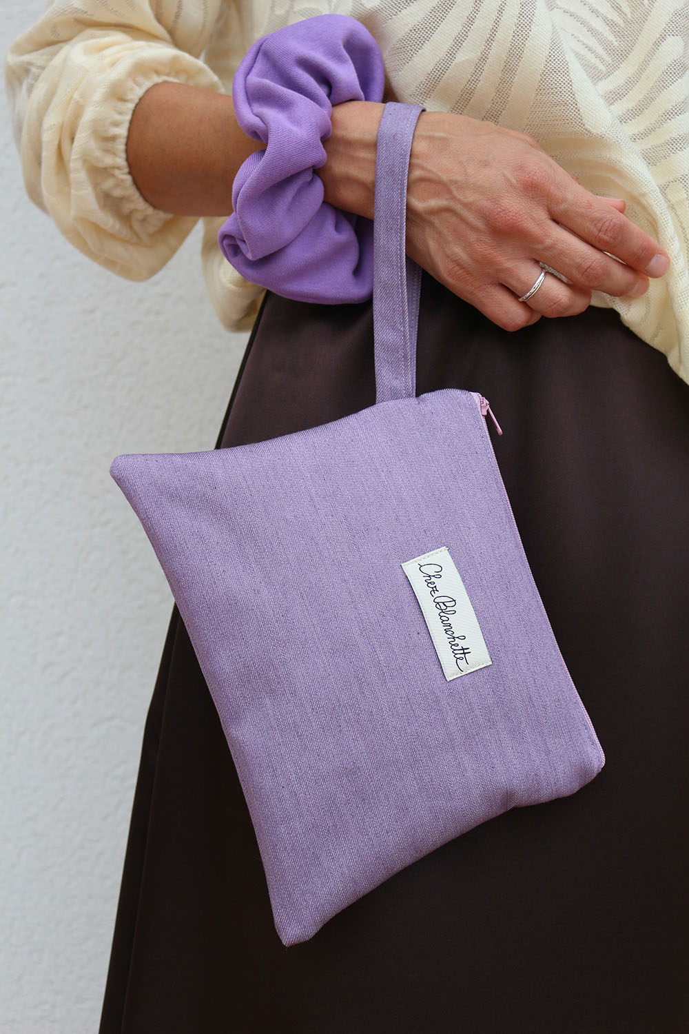Pochette con polsino in tessuto di recupero.