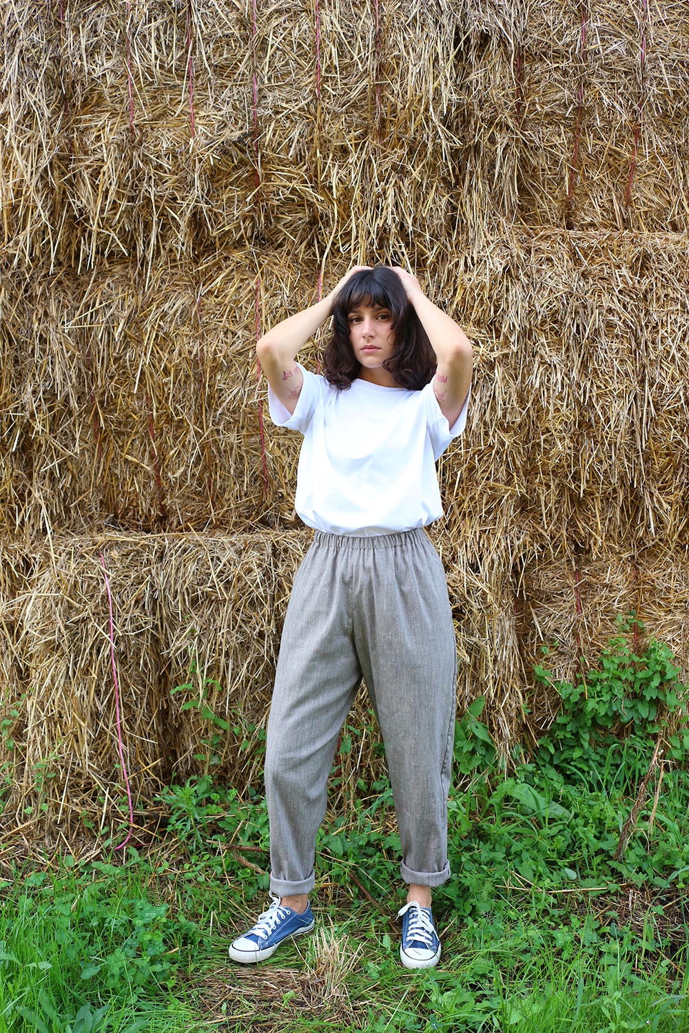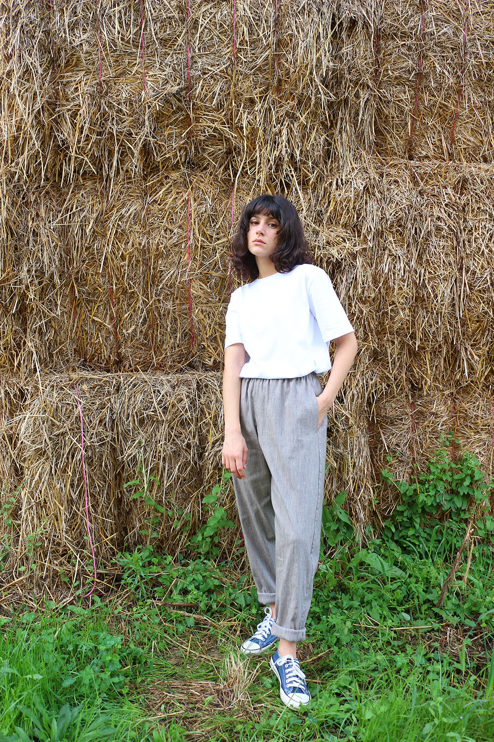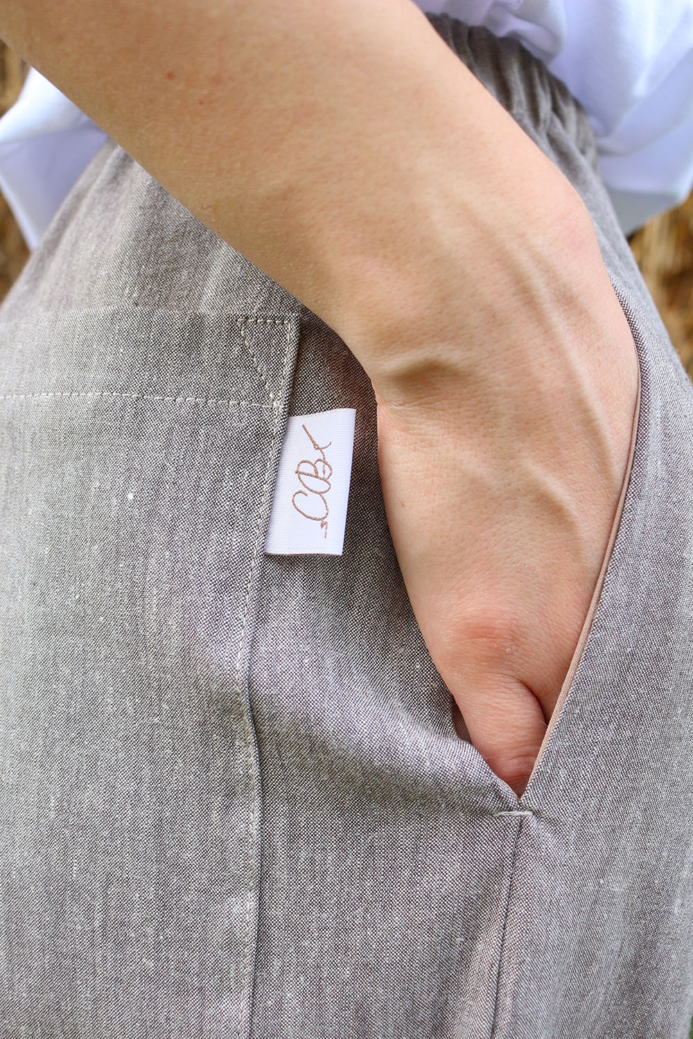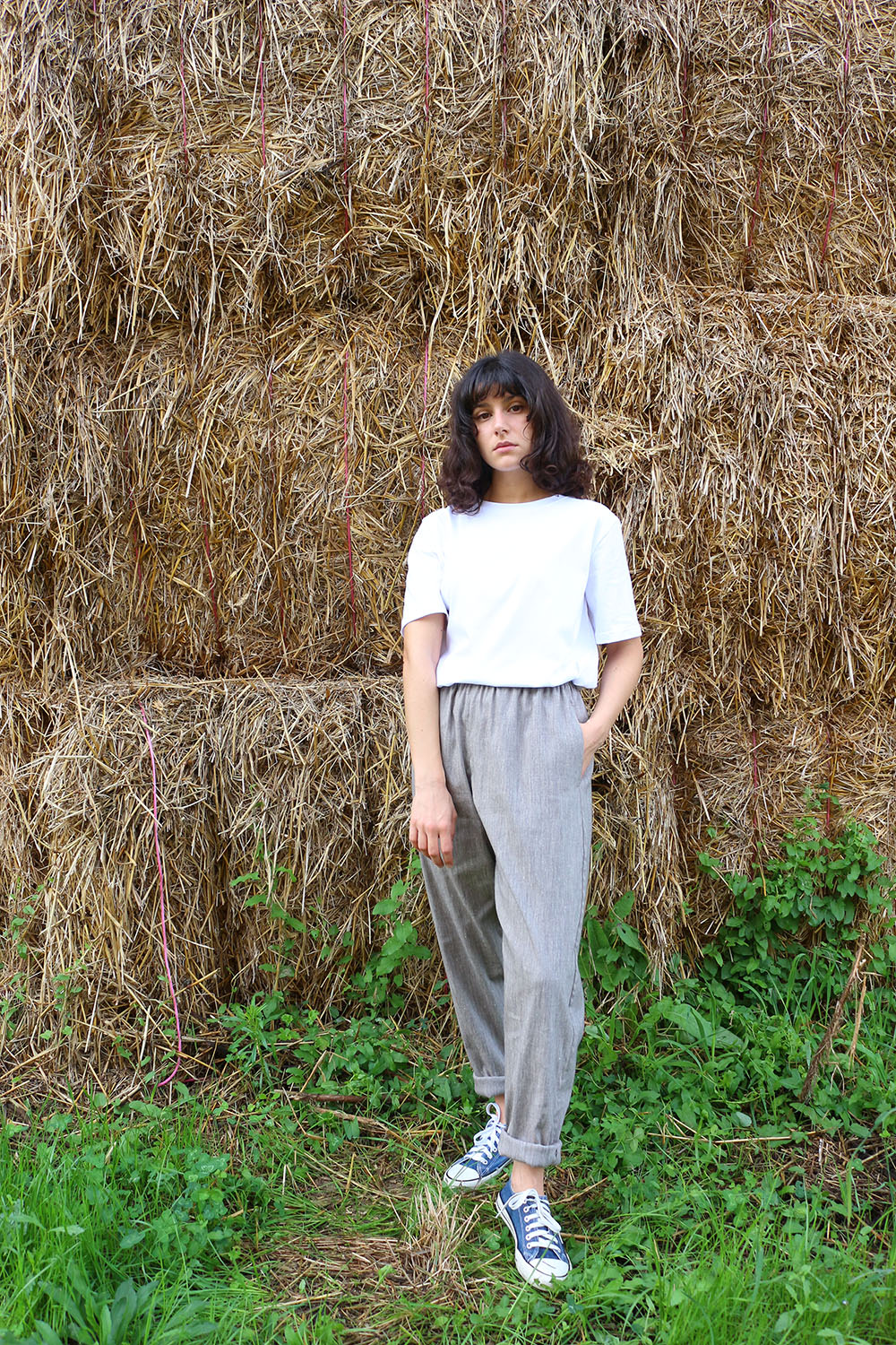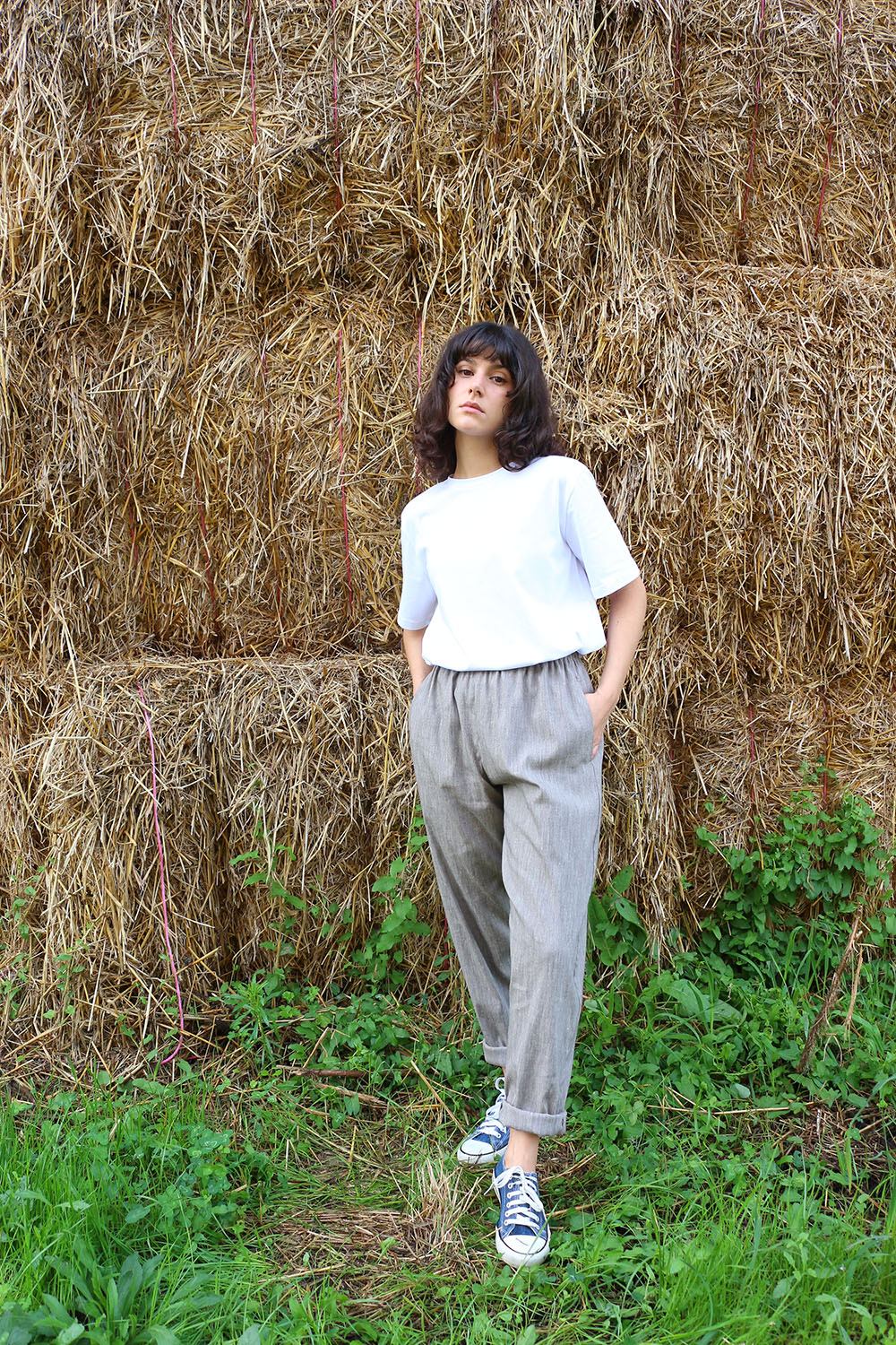 Pantalone comodo, con elastico in vita, vita alta, elastico morbido. Va indossato con risvoltini alla caviglia, tasche a scomparsa sui fianchi, tascone ton sur ton sulla natica destra.