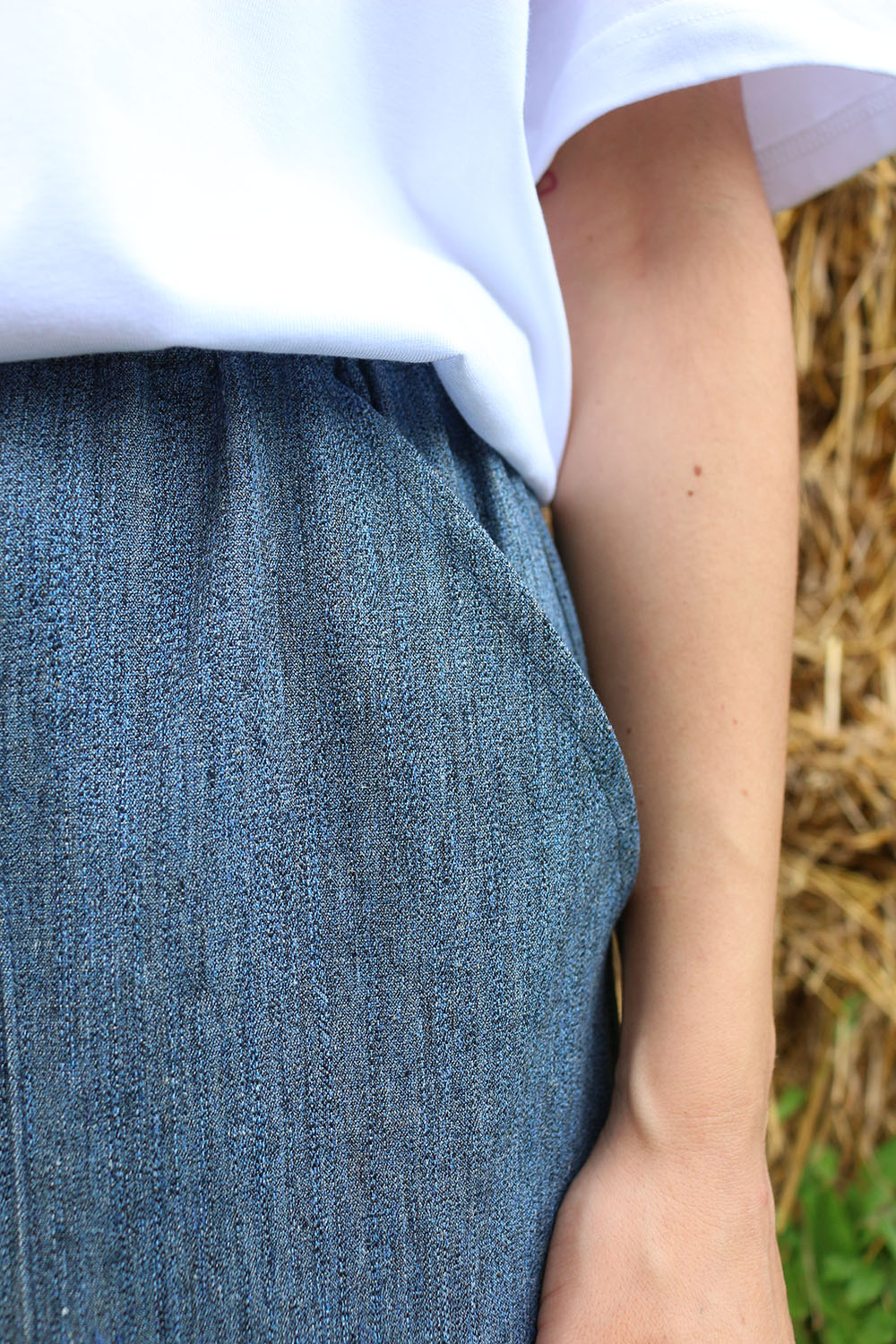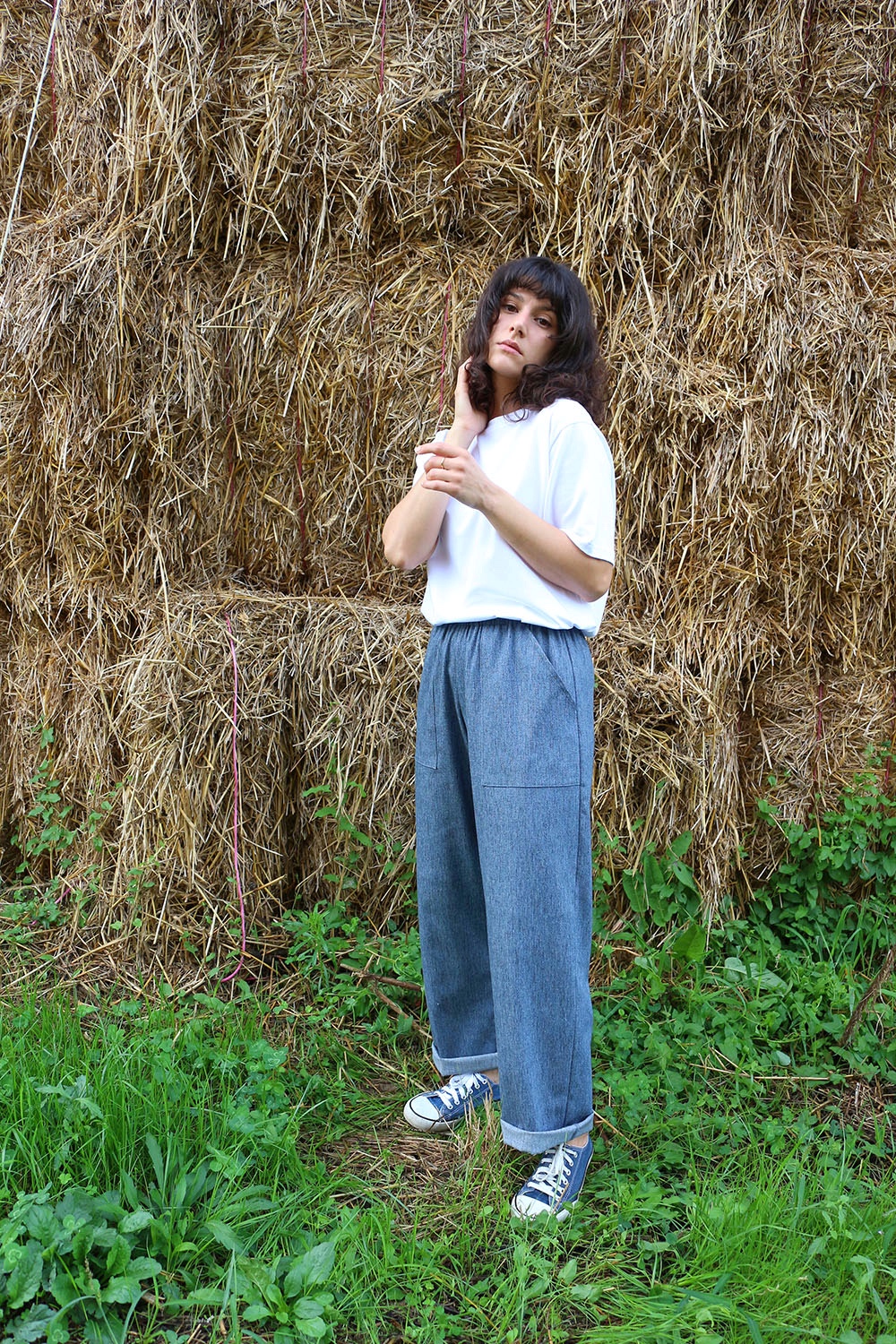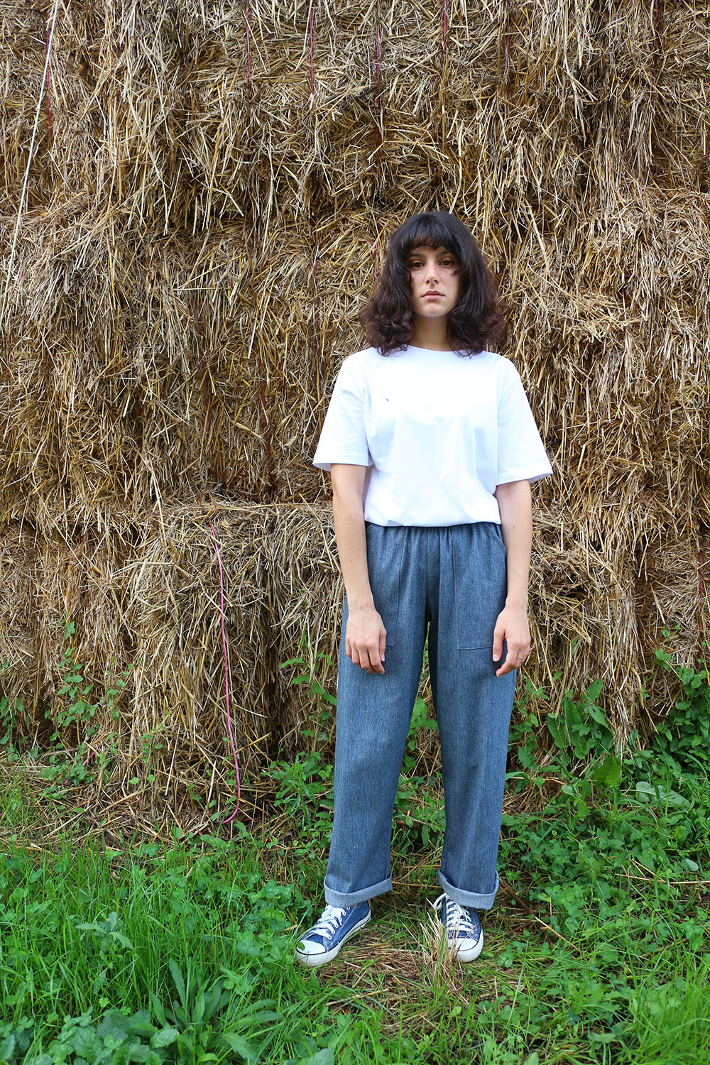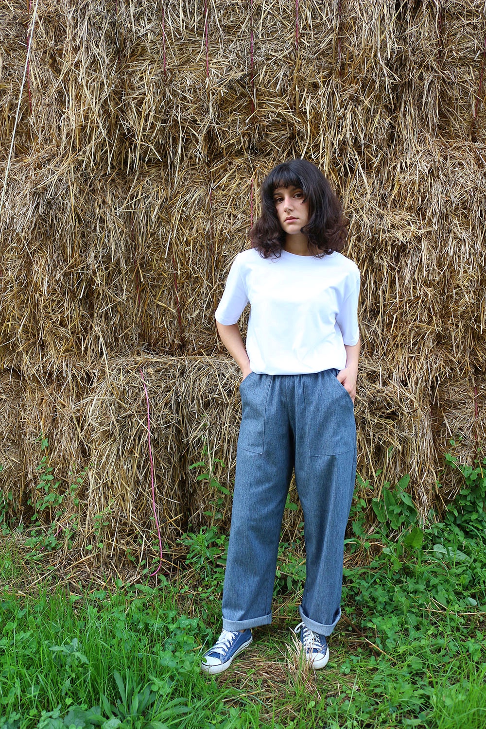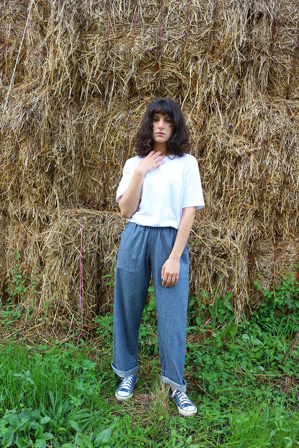 Pantalone comodo, con elastico in vita, vita alta, elastico morbido, gamba dritta. In base al tipo di tessuto le tasche saranno a scomparsa sui fianchi oppure applicate sui fianchi (come da foto illustrative) , tascone ton sur ton sulla natica destra.
