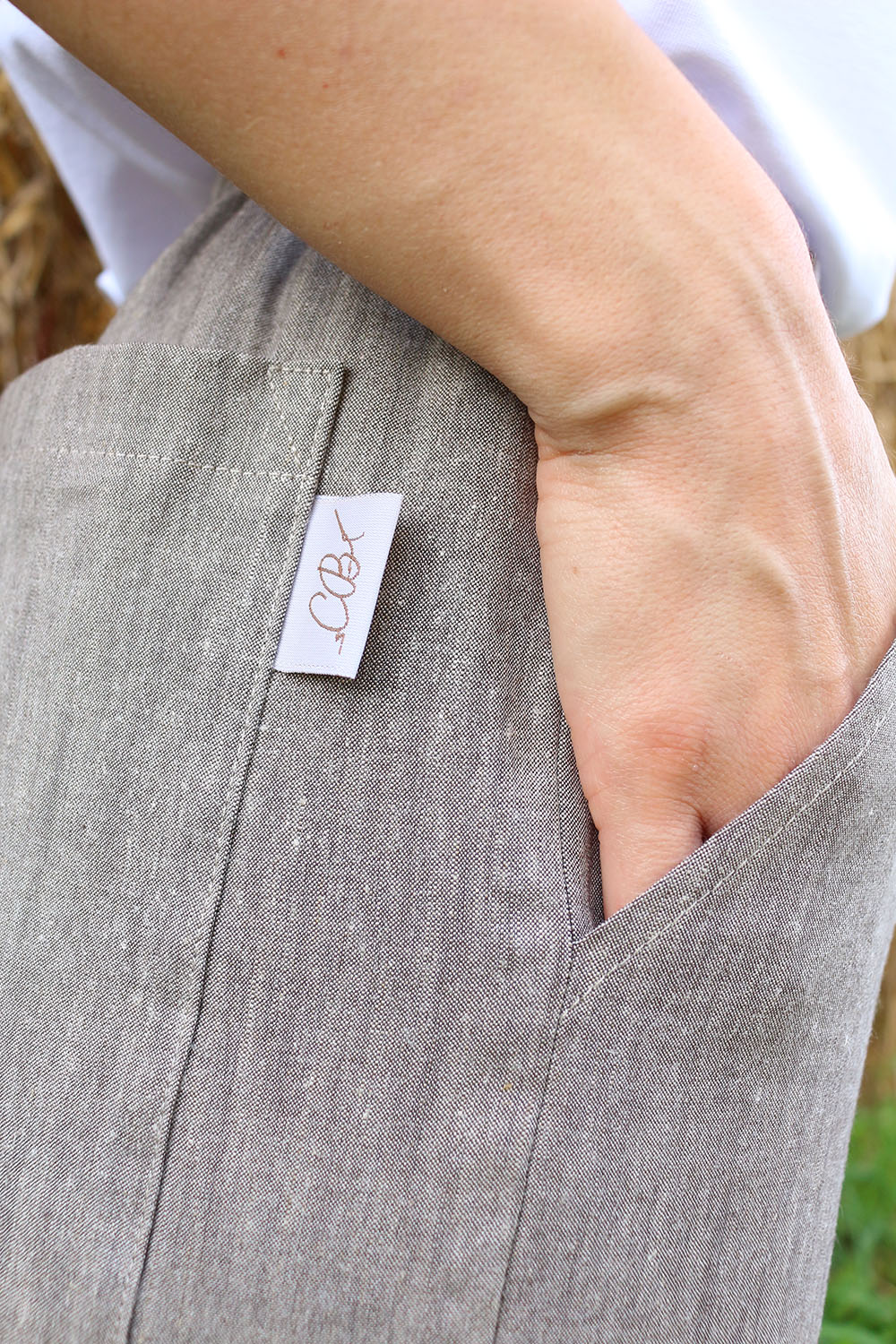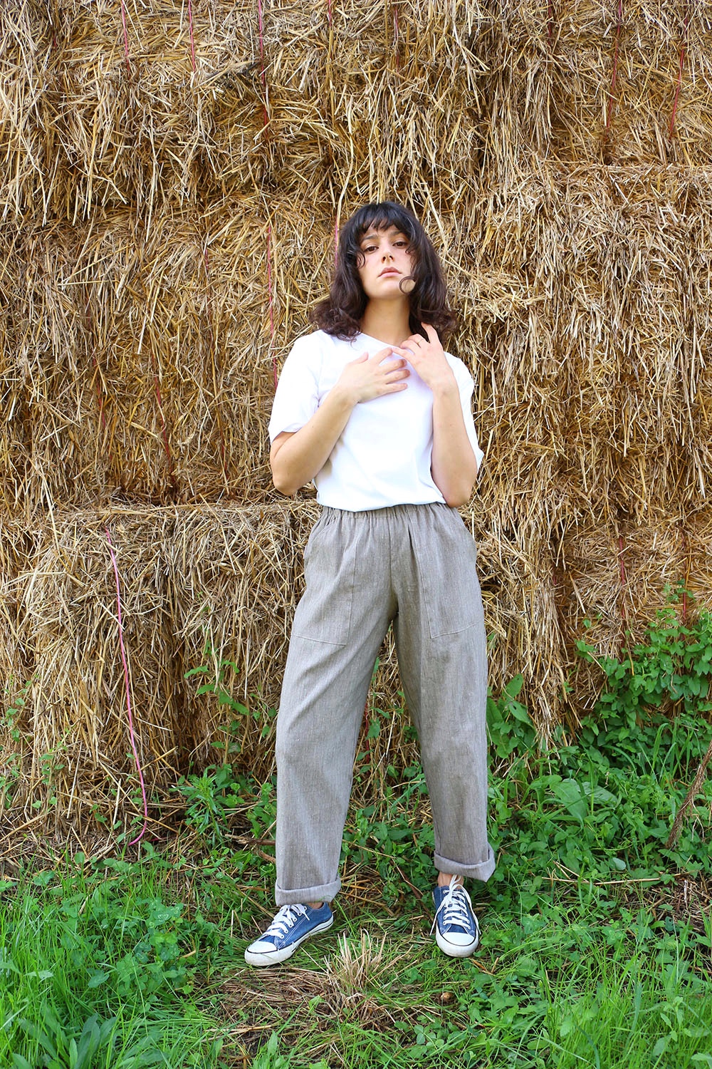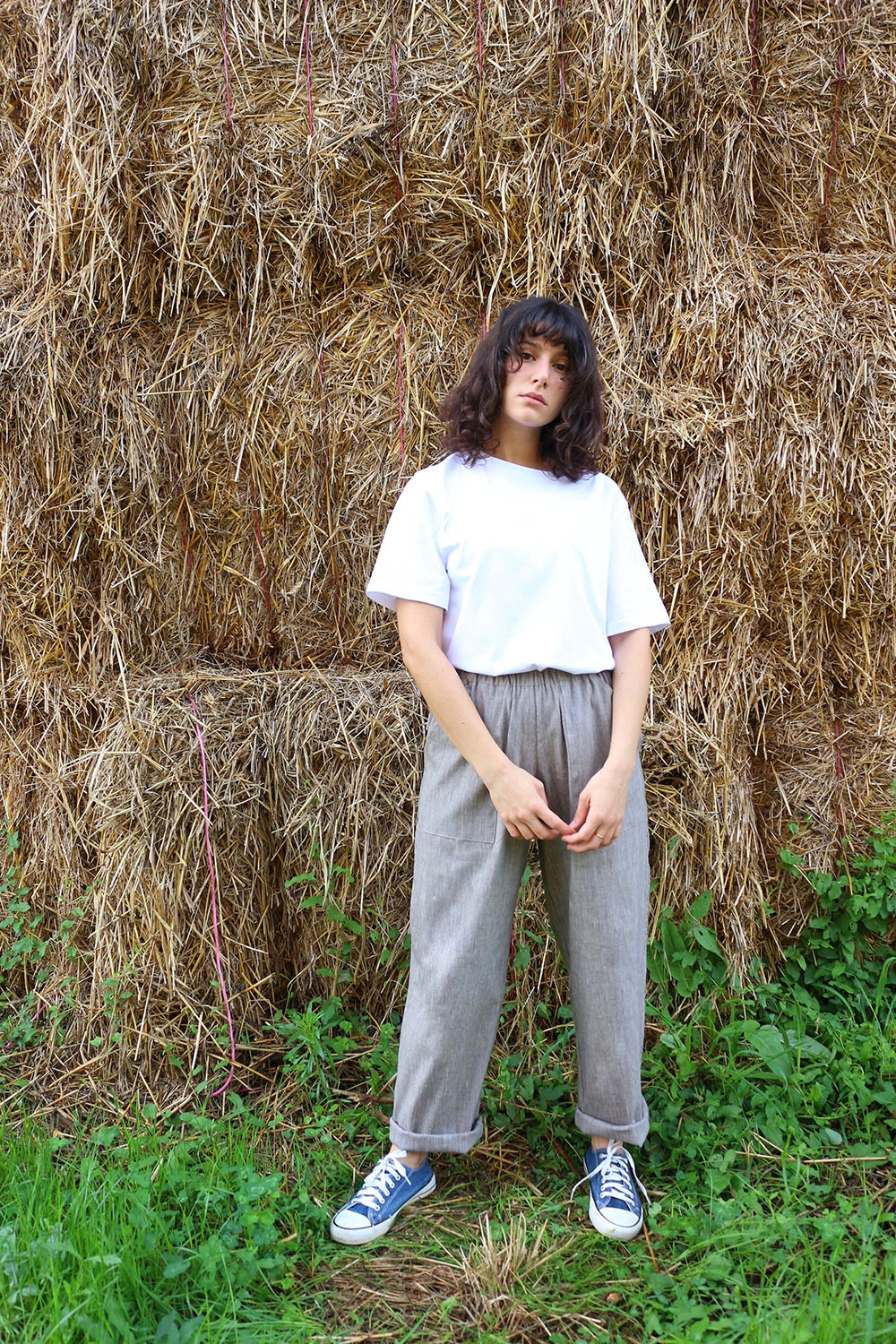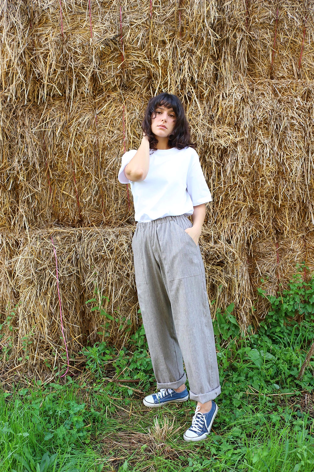 Pantalone comodo, con elastico in vita, vita alta, elastico morbido, gamba dritta. In base al tipo di tessuto le tasche saranno a scomparsa sui fianchi oppure applicate sui fianchi (come da foto illustrative) , tascone ton sur ton sulla natica destra.