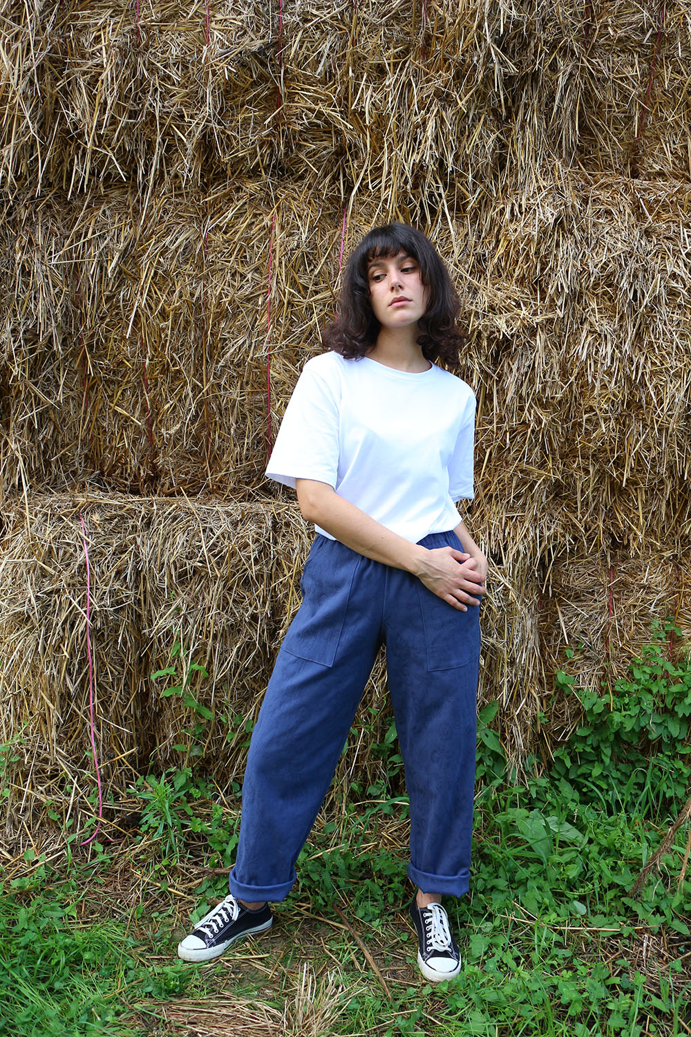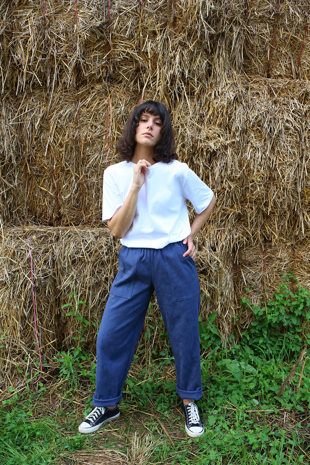 Pantalone comodo, con elastico in vita, vita alta, elastico morbido, gamba dritta. In base al tipo di tessuto le tasche saranno a scomparsa sui fianchi oppure applicate sui fianchi (come da foto illustrative) , tascone ton sur ton sulla natica destra.