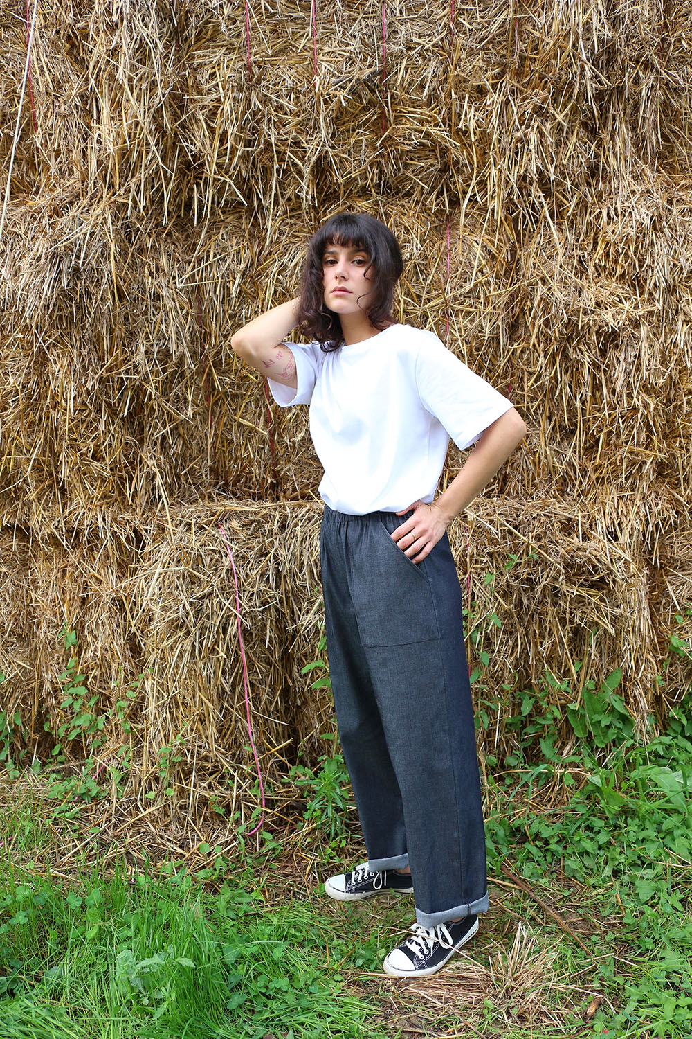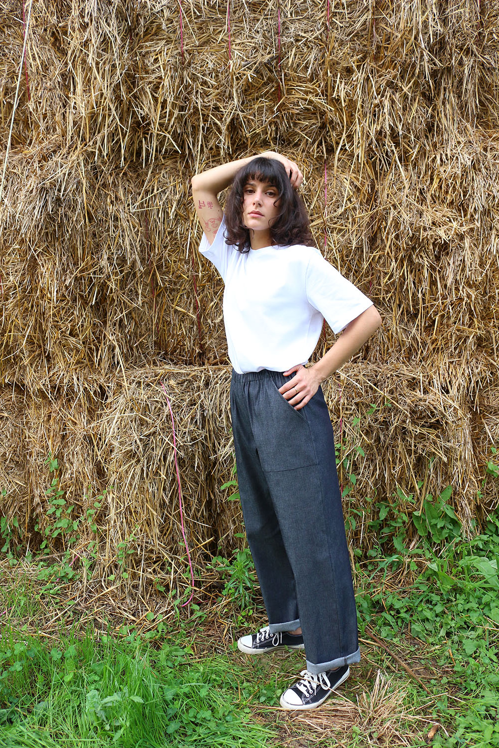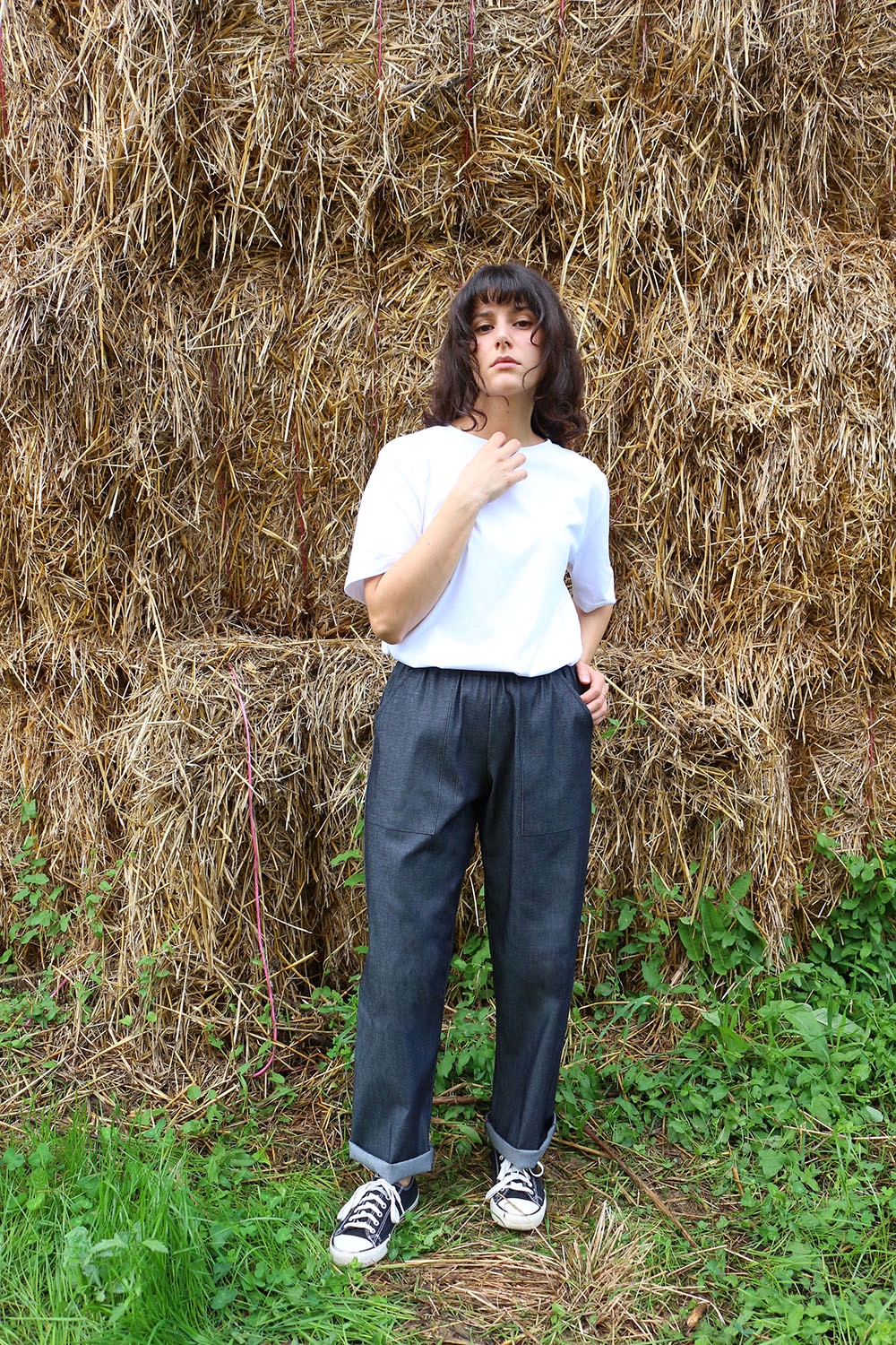 Pantalone comodo, con elastico in vita, vita alta, elastico morbido, gamba dritta. In base al tipo di tessuto le tasche saranno a scomparsa sui fianchi oppure applicate sui fianchi (come da foto illustrative) , tascone ton sur ton sulla natica destra.