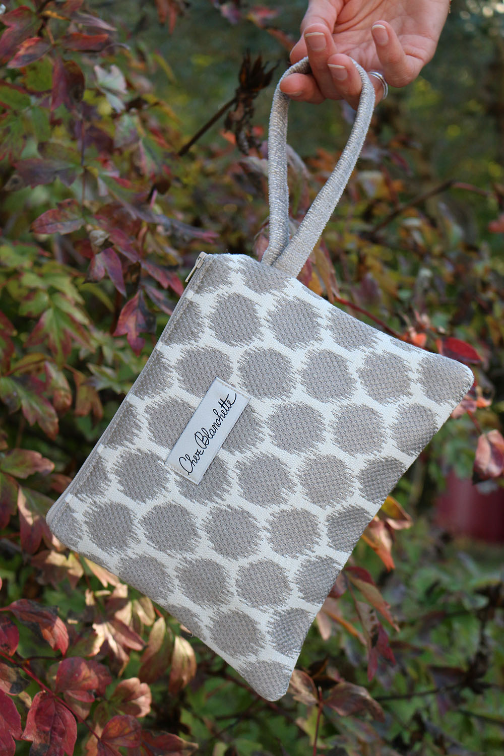 Pochette con polsino in tessuto di recupero.