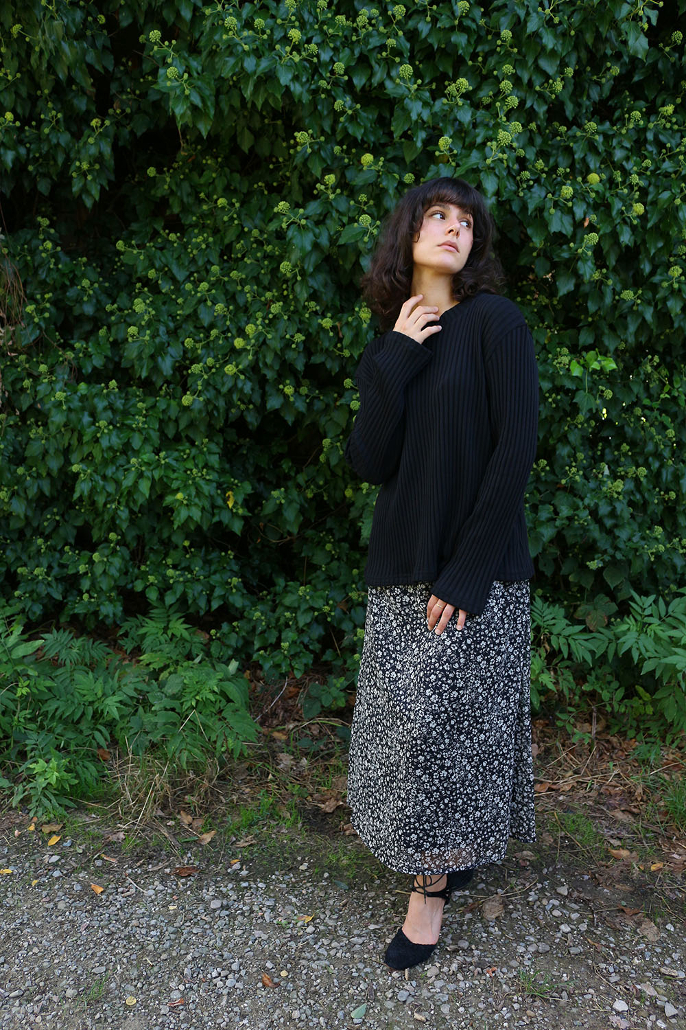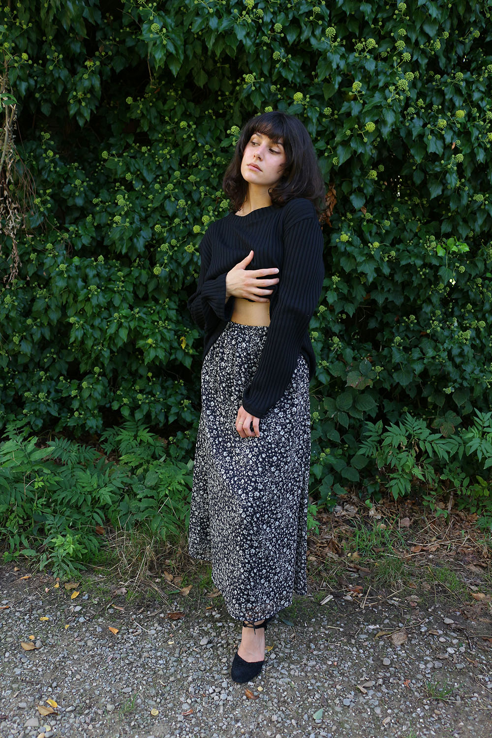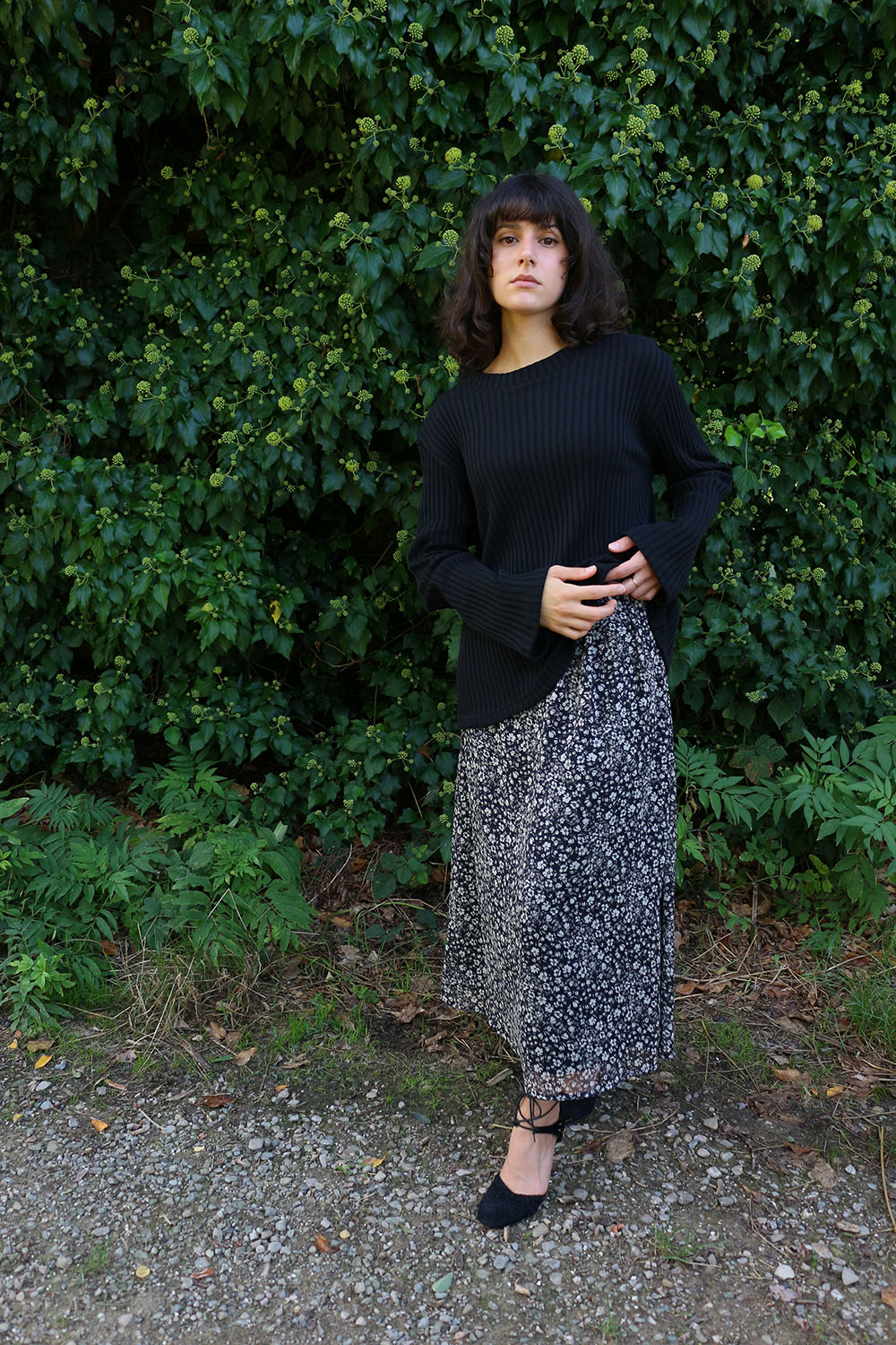 lunga 83cm, vita con elastico da 64cm a 105cm, fianchi molto ampi (da portare unicamente a vita alta)