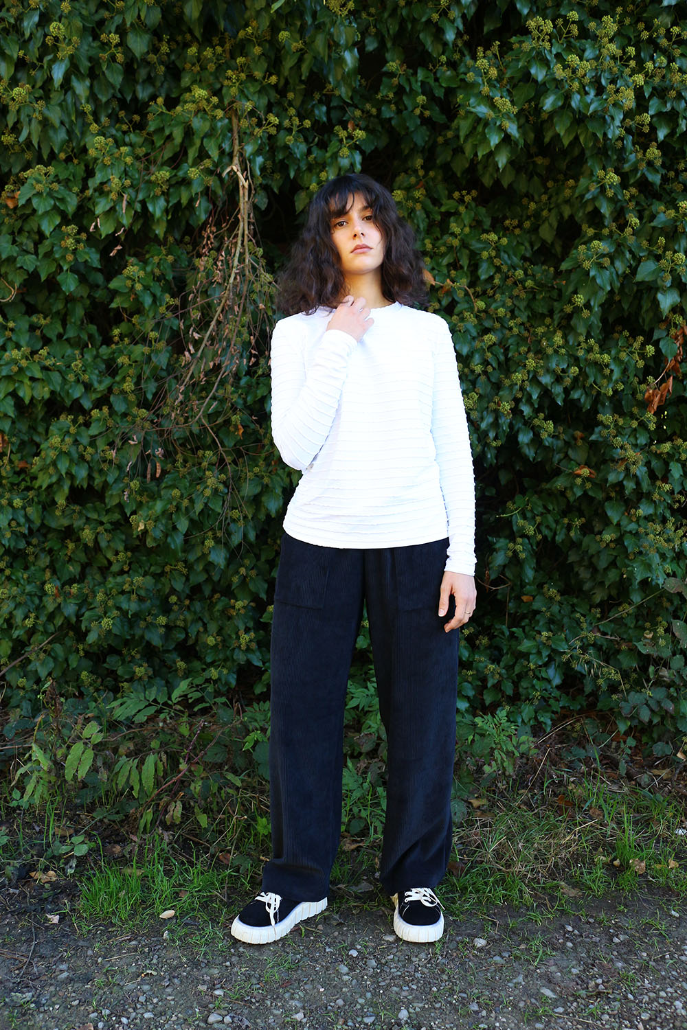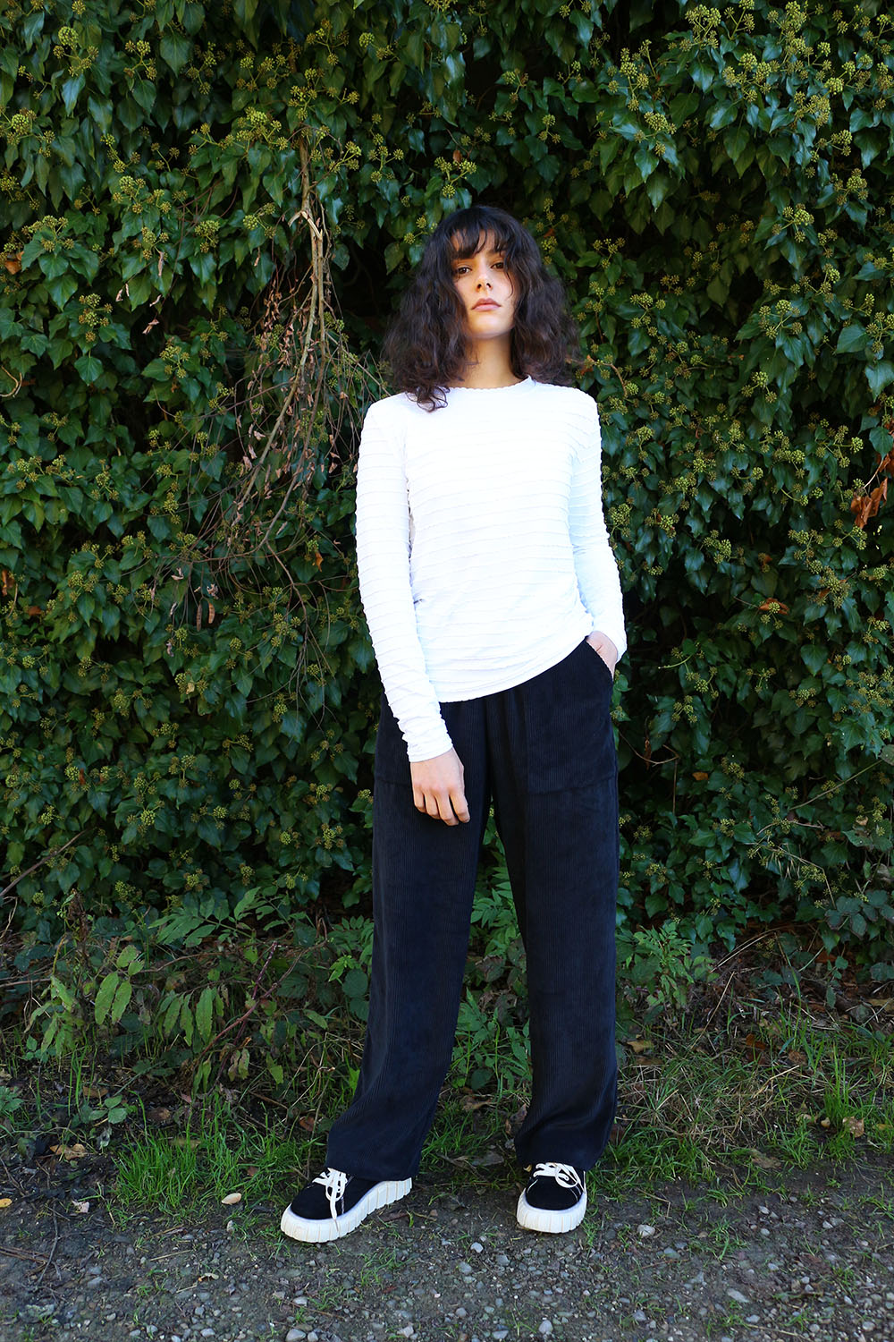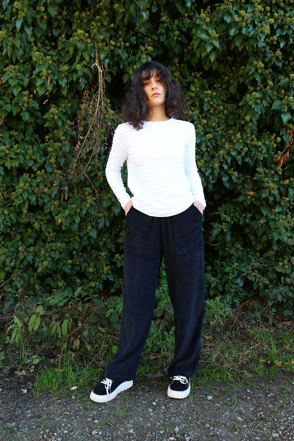 Pantalone comodo, con elastico in vita, vita alta, elastico morbido, gamba dritta. In base al tipo di tessuto le tasche saranno a scomparsa sui fianchi oppure applicate sui fianchi (come da foto illustrative) , tascone ton sur ton sulla natica destra.
