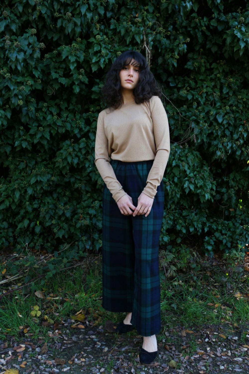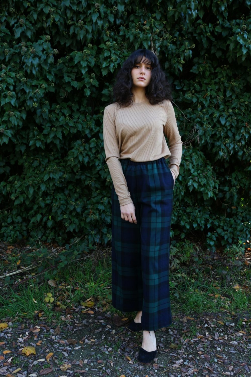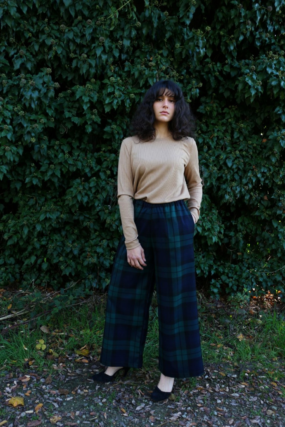 Pantalone comodo, vita alta, elastico morbido in vita, largo su coscia e caviglie. In base al tipo di tessuto le tasche saranno a scomparsa sui fianchi oppure applicate sui fianchi (come da foto illustrative).