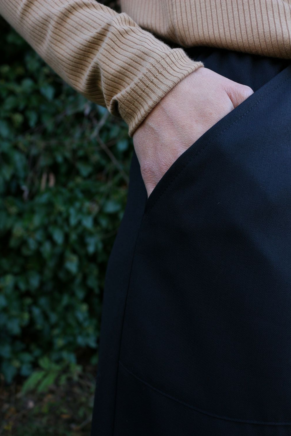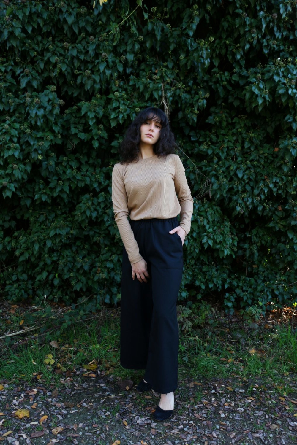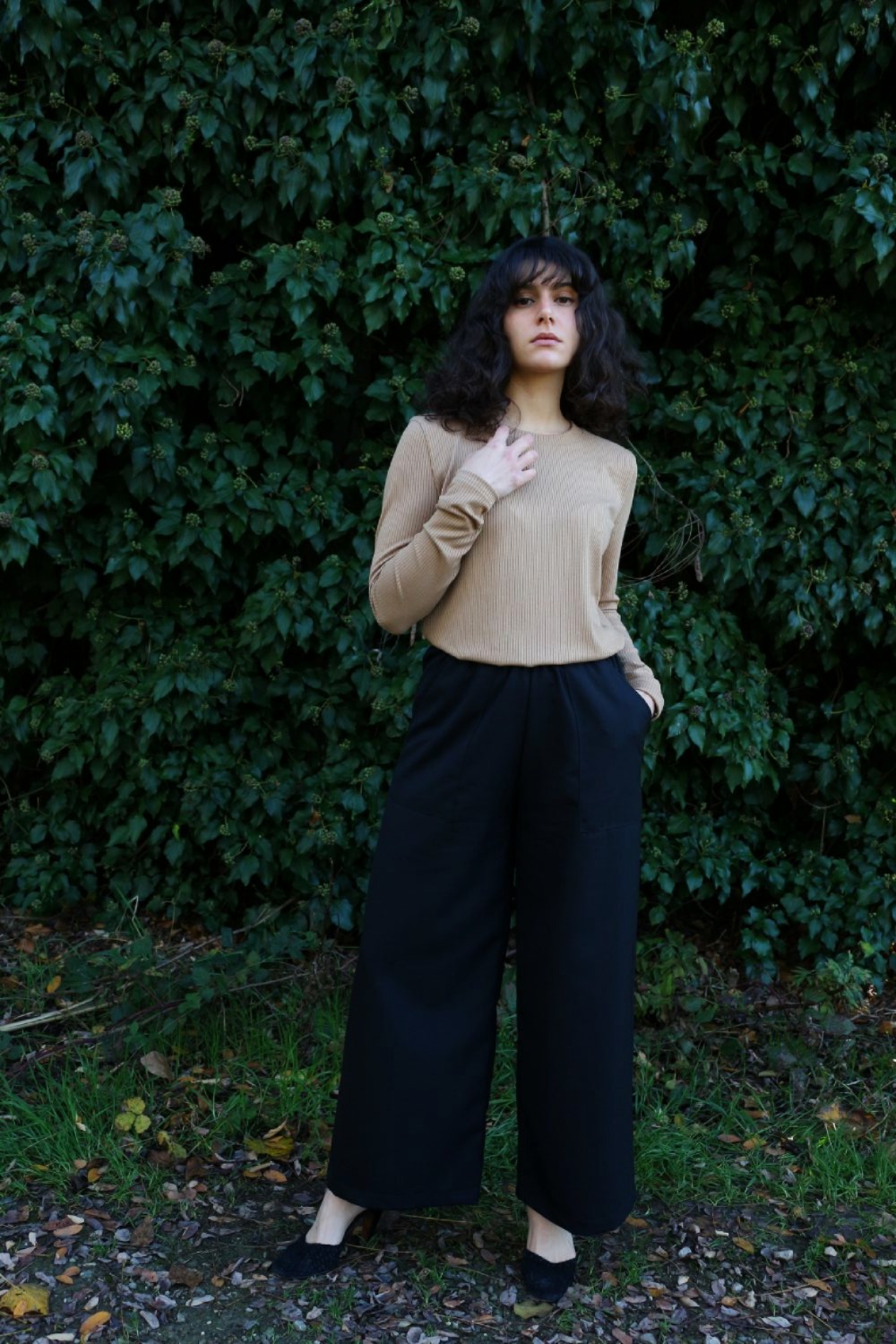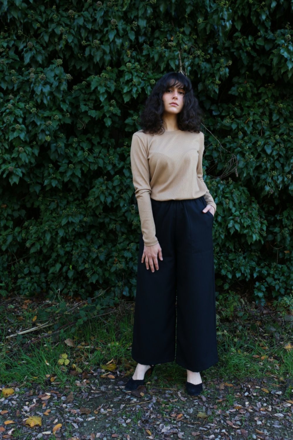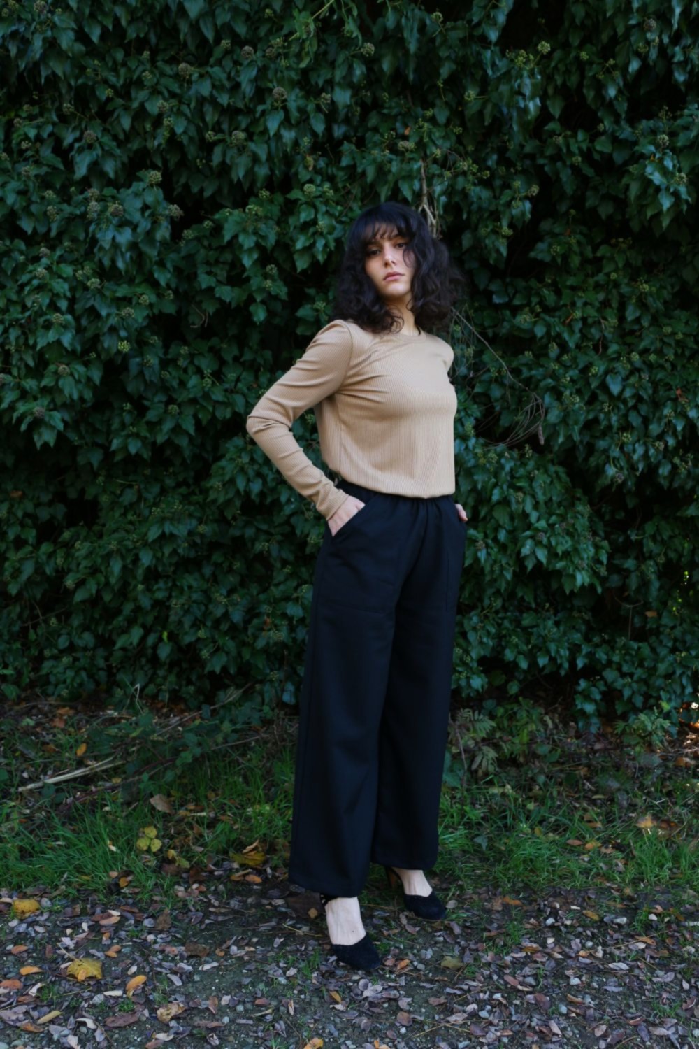 Pantalone comodo, vita alta, elastico morbido in vita, largo su coscia e caviglie. In base al tipo di tessuto le tasche saranno a scomparsa sui fianchi oppure applicate sui fianchi (come da foto illustrative).