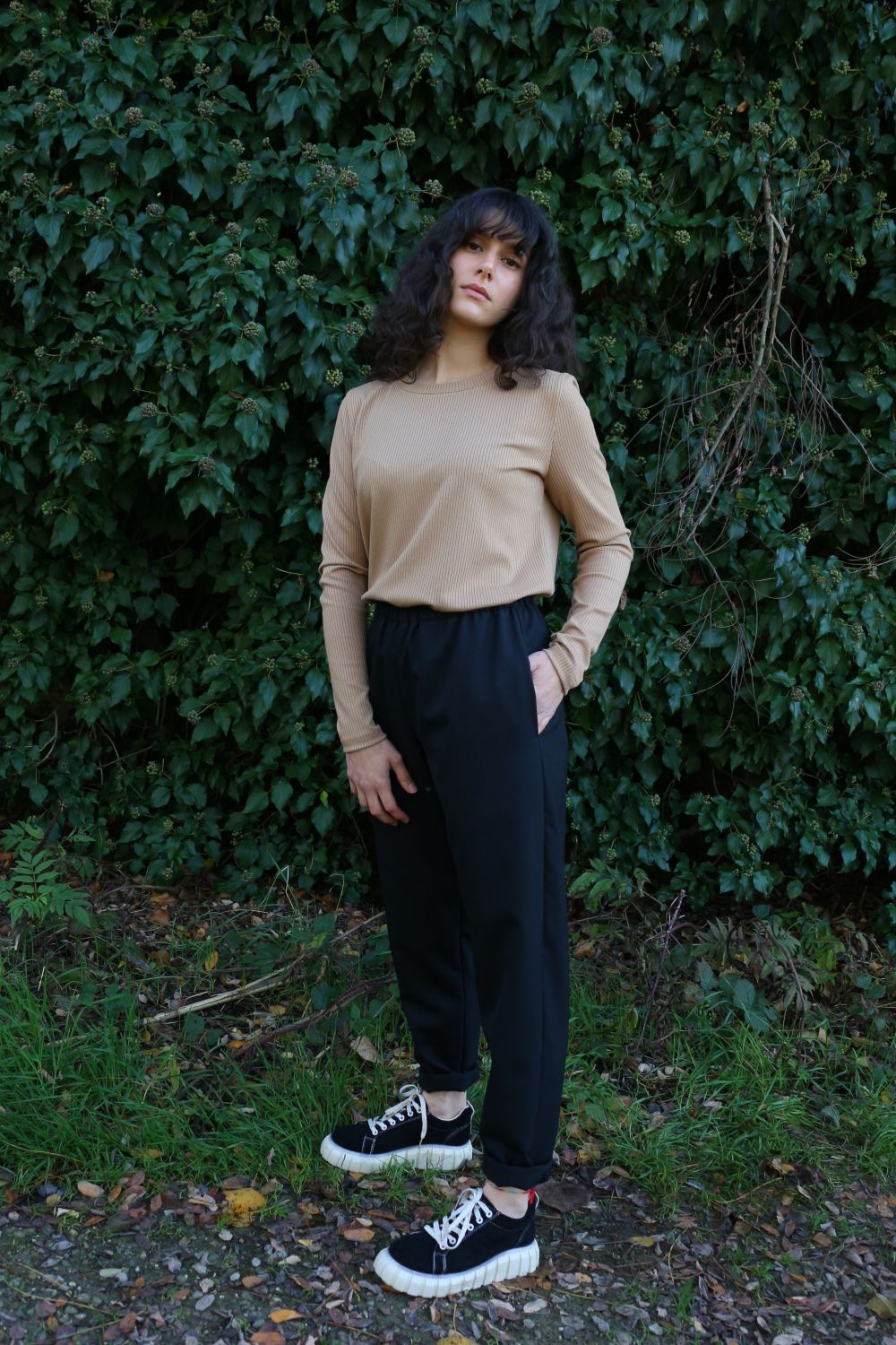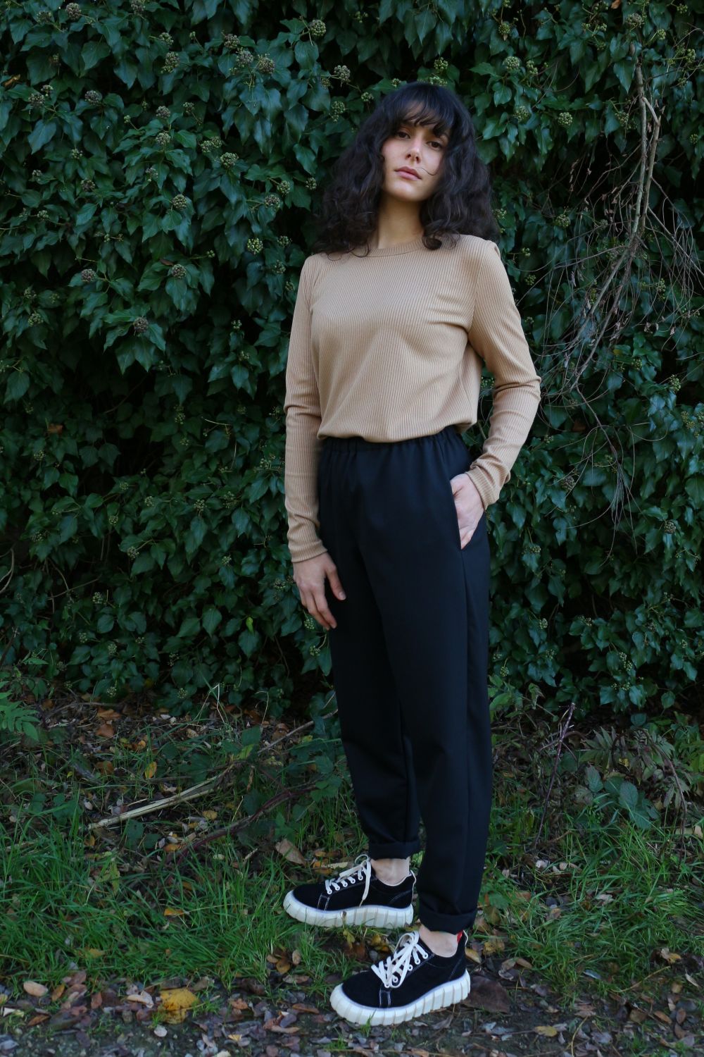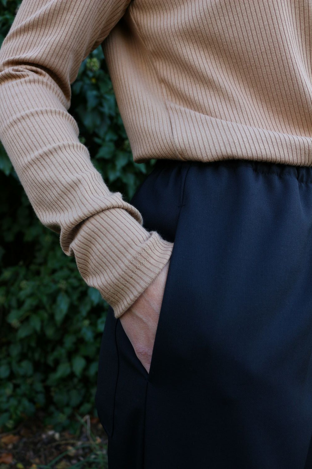 Pantalone comodo, con elastico in vita, vita alta, elastico morbido. Va indossato con risvoltini alla caviglia, tasche a scomparsa sui fianchi, tascone ton sur ton sulla natica destra.