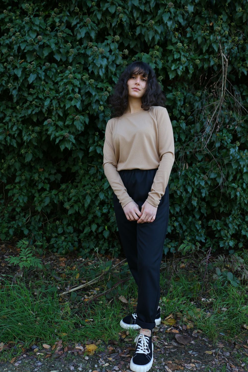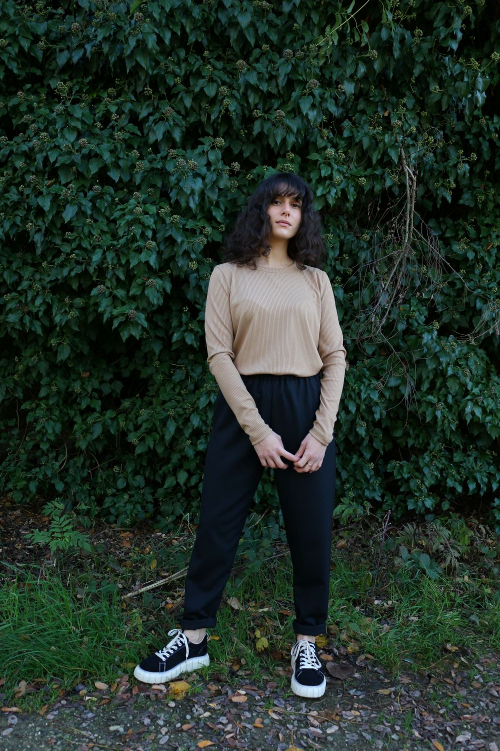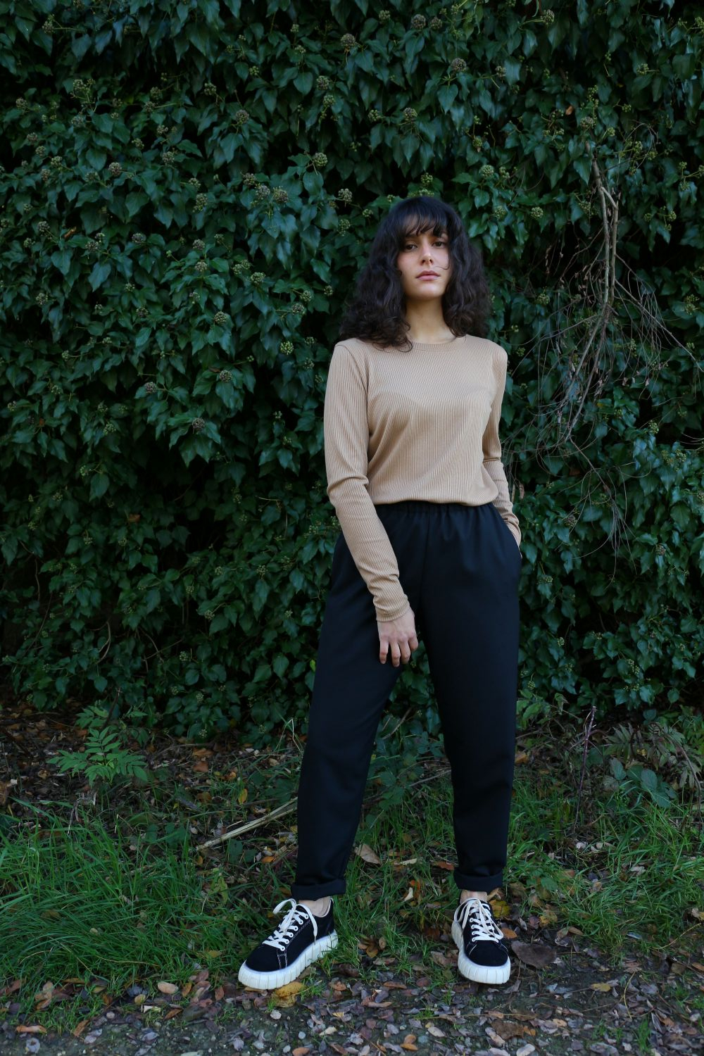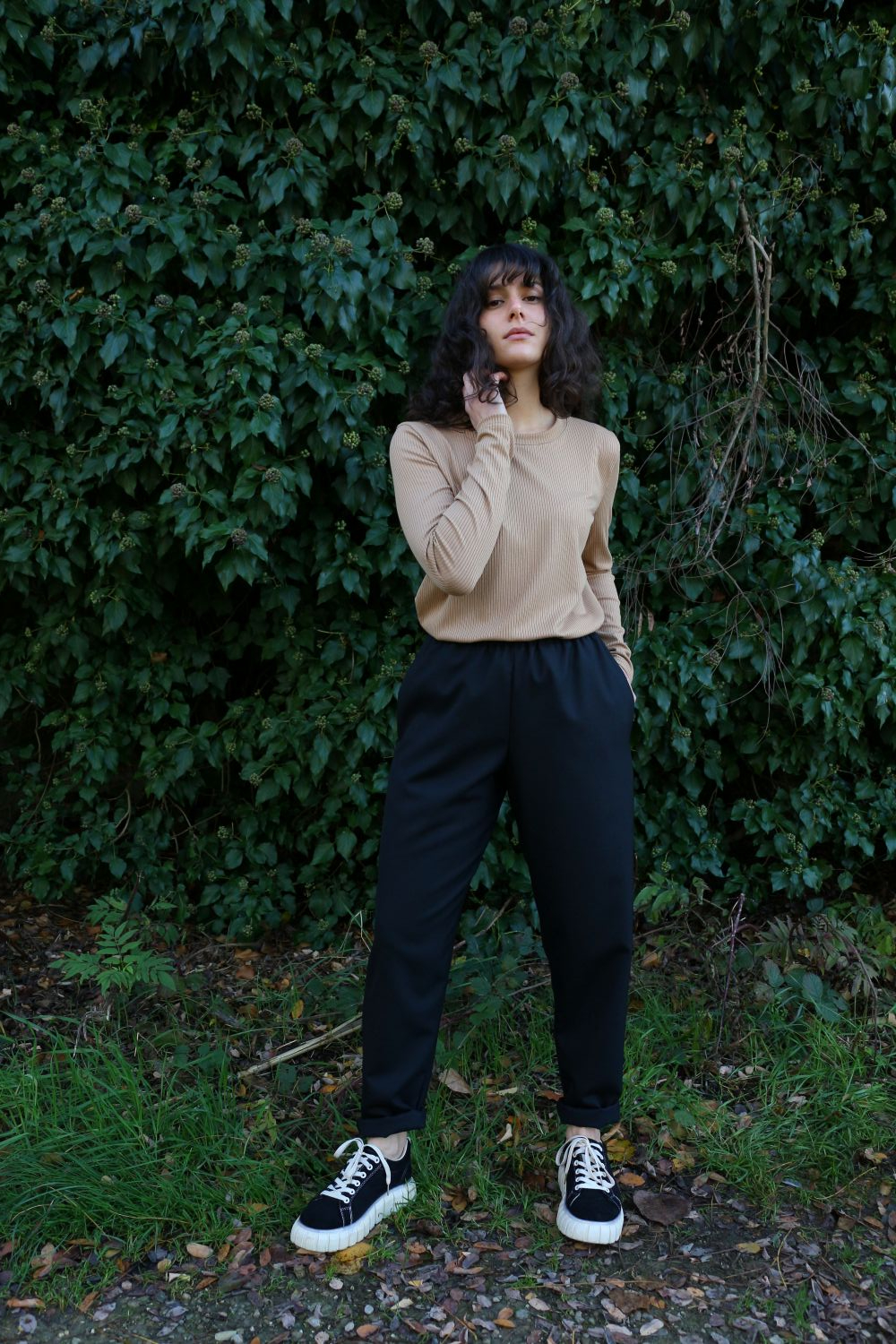 Pantalone comodo, con elastico in vita, vita alta, elastico morbido. Va indossato con risvoltini alla caviglia, tasche a scomparsa sui fianchi, tascone ton sur ton sulla natica destra.